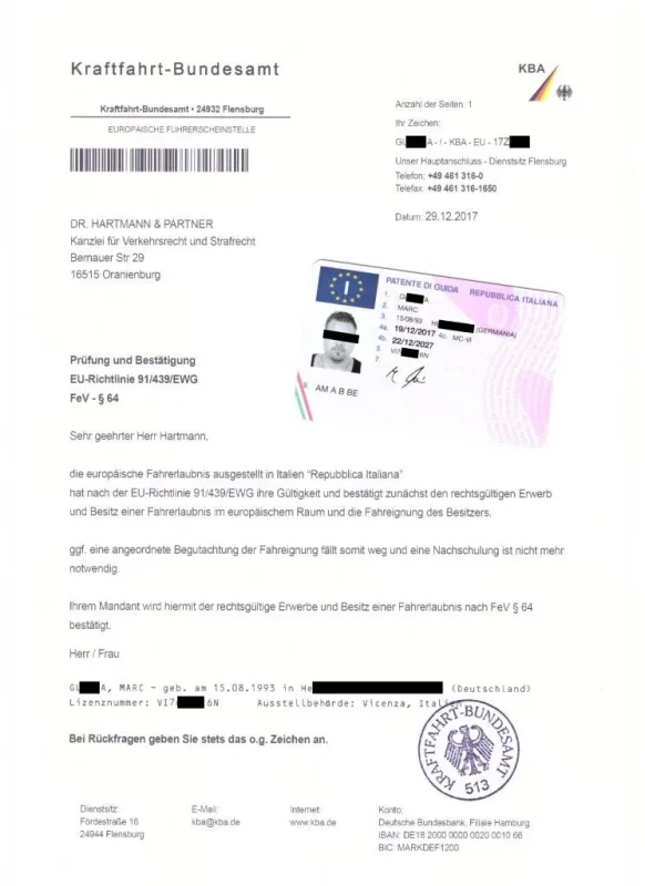 Das Kraftfahrt-Bundesamt (KBA) in Flensburg erkennt EU-Führerscheine als rechtsgültig & legal an. 🔹 Prüfung & Bestätigung: Das KBA führt eine Prüfung durch und stellt eine schriftliche Bestätigung über die Echtheit der Fahrerlaubnis aus.